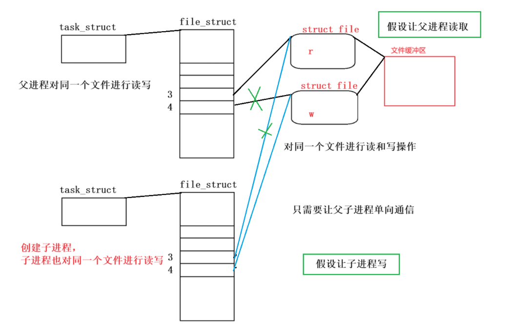 当父进程以读或者写的方式,打开一个文件的时候,子进程也会以同样的方式,以读或者写方式打开一个文件,此时就无法进行父进程写入,子进程写入的进程读取,所以需要通过下面的方式来进行通信: