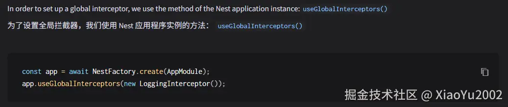 当然由于InterceptorInterceptor拦截器是一个类,所以我们需要使用new运算符创建拦截器的实例以供使用。到这里,InterceptorInterceptor拦截器就是全局使用,即每一个接口都会经过该拦截器。Nest.js全局注册的官方文档如图3-2所示。