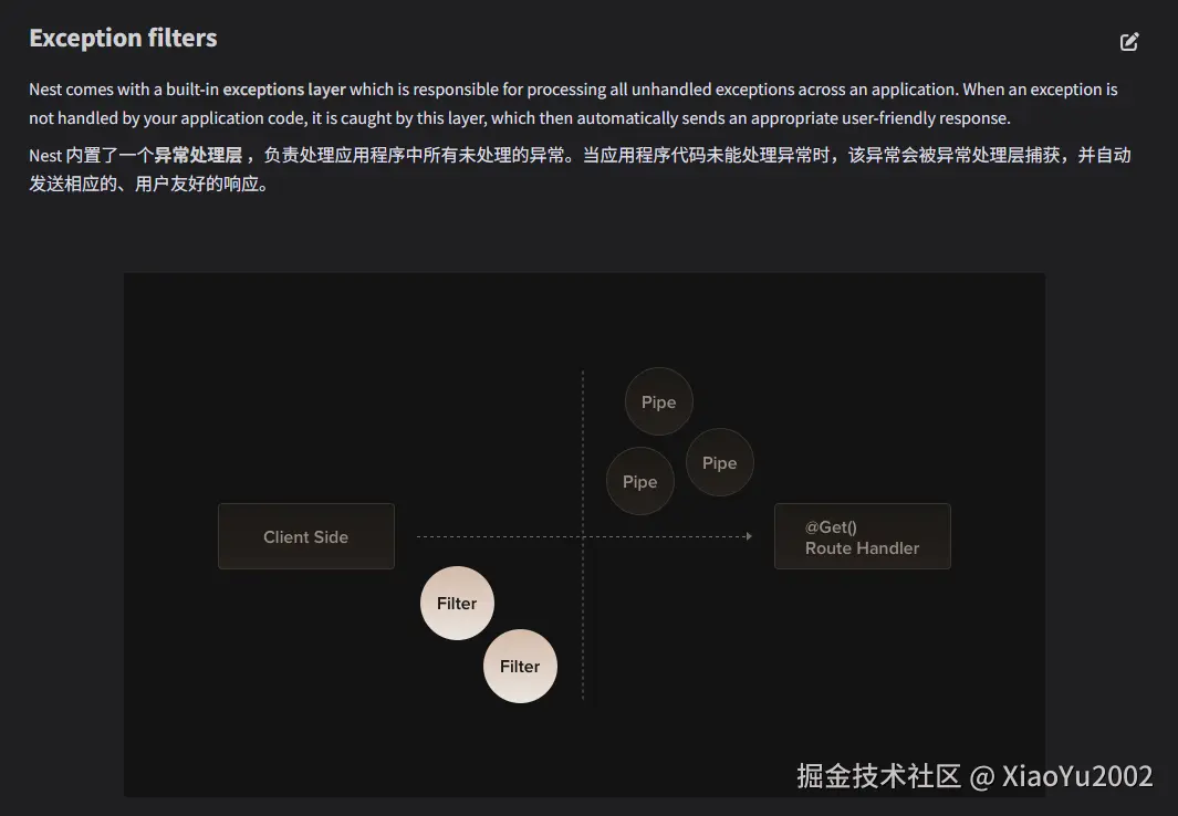 只有当我们明确在@Catch()中指定具体的异常类型(如 @Catch(HttpException) 或 @Catch(WsException)),过滤器才会从"捕获所有异常"转变为"仅处理特定类型的异常"。如图3-6所示的官方文档也说明了不同协议层(HTTP 与 WebSocket)对应的异常类型不同,因此需要在 @Catch() 中明确指定对应的异常类型。