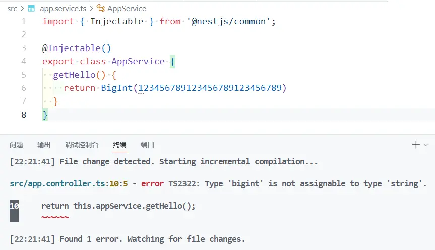 我们已经在全局拦截器中处理好类型转换问题(BigInt转String),如果还有问题,就只能在第一步的接口返回数据给前端的步骤中。前端访问的是接口,而接口是体现形式是路由,路由层从业务层获取数据返回给前端。因此在业务层的数据是BigInt类型,则路由层所拿到的数据也会是BigInt类型。由于Nest.js是强制使用TypeScript的,所以我们需要到app.controller.ts文件中将get默认请求所返回的类型限制从string改成any类型或者string和bigint的联合类型。此时就能正常运行代码。