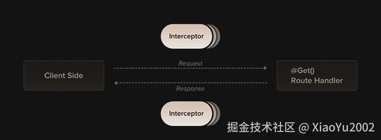Nest.js的拦截器和axios的拦截器是类似的,可以在网络请求处理的前后去执行额外的逻辑。拦截器从字面意思理解就是拦截,假设有流程A->B,拦截器要做的是A到B的过程中,将内容拦截下来处理后再丢给B,变成了A->拦截器->B。