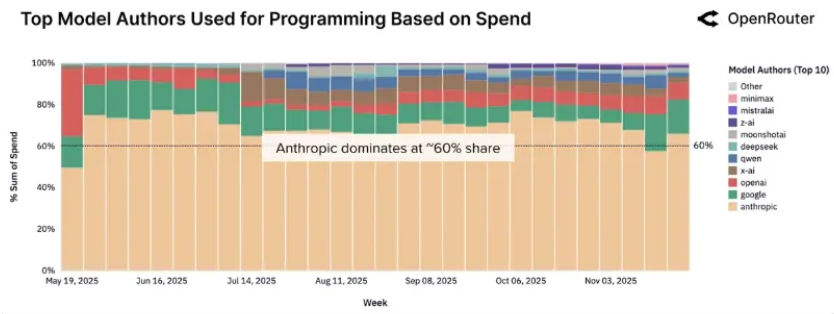 值得注意的是,根据 OpenRouter 和 Anthropic 的数据,Anthropic 在编码类别中占据主导地位: