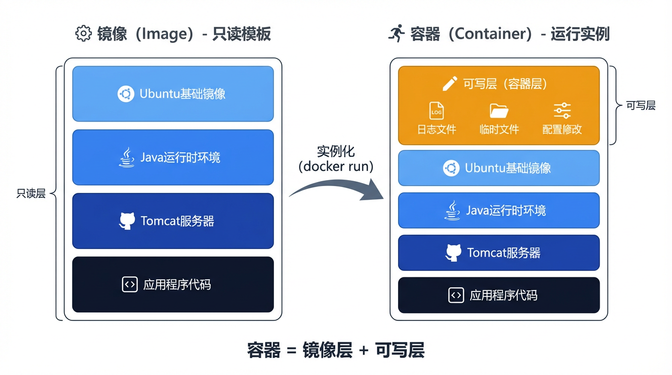 镜像:只读模板,用于创建 Docker 容器,包含运行应用程序所需的代码、运行时、系统工具和库。