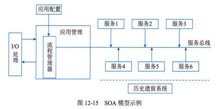 SOA并不仅仅是一种开发方法,还具有管理上的优点,管理员可直接管理开发人员所构建的相同服务,多个服务通过企业服务总线(ESB)提出服务请求,由应用管理来进行处理,如下: