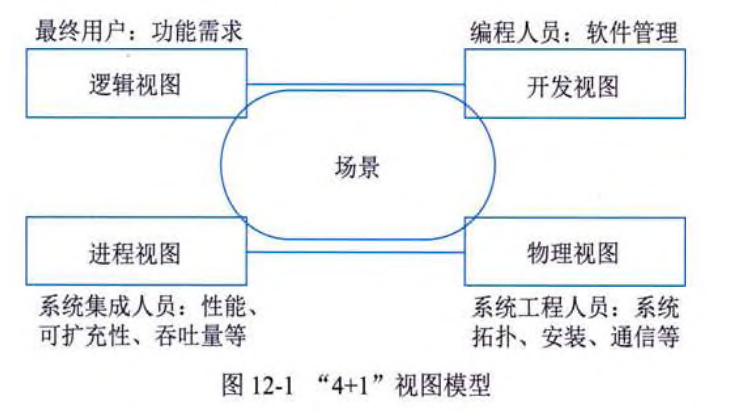 - (4)高级阶段。以描述系统的高层抽象结构为中心,不关心具体的建模细节,划分了架构模型与传统软件结构的界限。该阶段以Kruchten提出的"4+1"模型为标志。