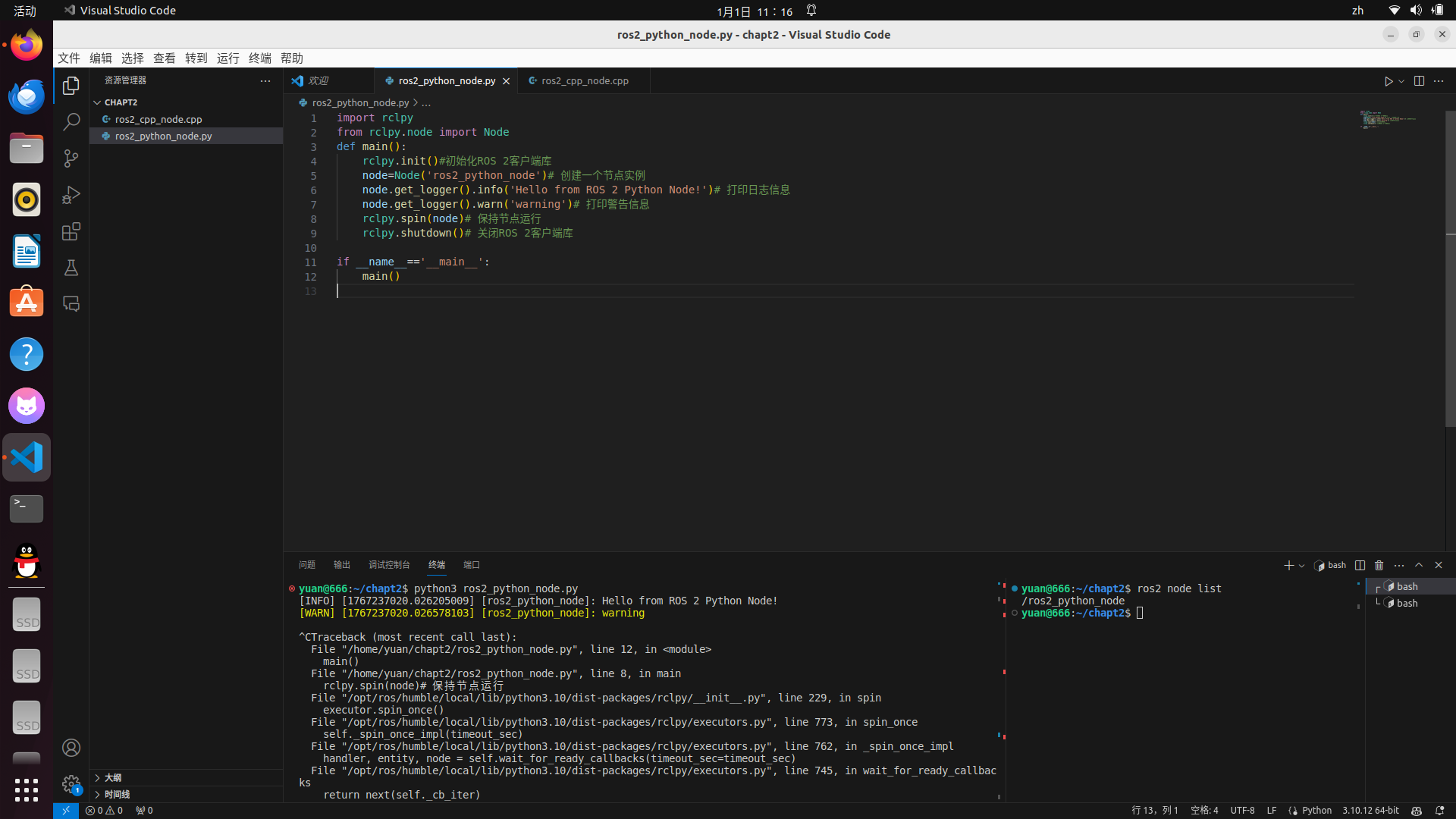 大家好!这里是【多喝热水系列】ROS2入门专栏,今天是咱们从零开始的第四天。在前两天的内容里,我们搞定了ROS2环境配置、熟悉了基础命令行工具,也对"节点"这个核心概念有了初步认知------节点是ROS2系统的最小功能单元,所有业务逻辑都要依托节点实现。今天,我们就直击核心:分别用Python和C++两种语言编写代码,创建属于自己的ROS2节点。