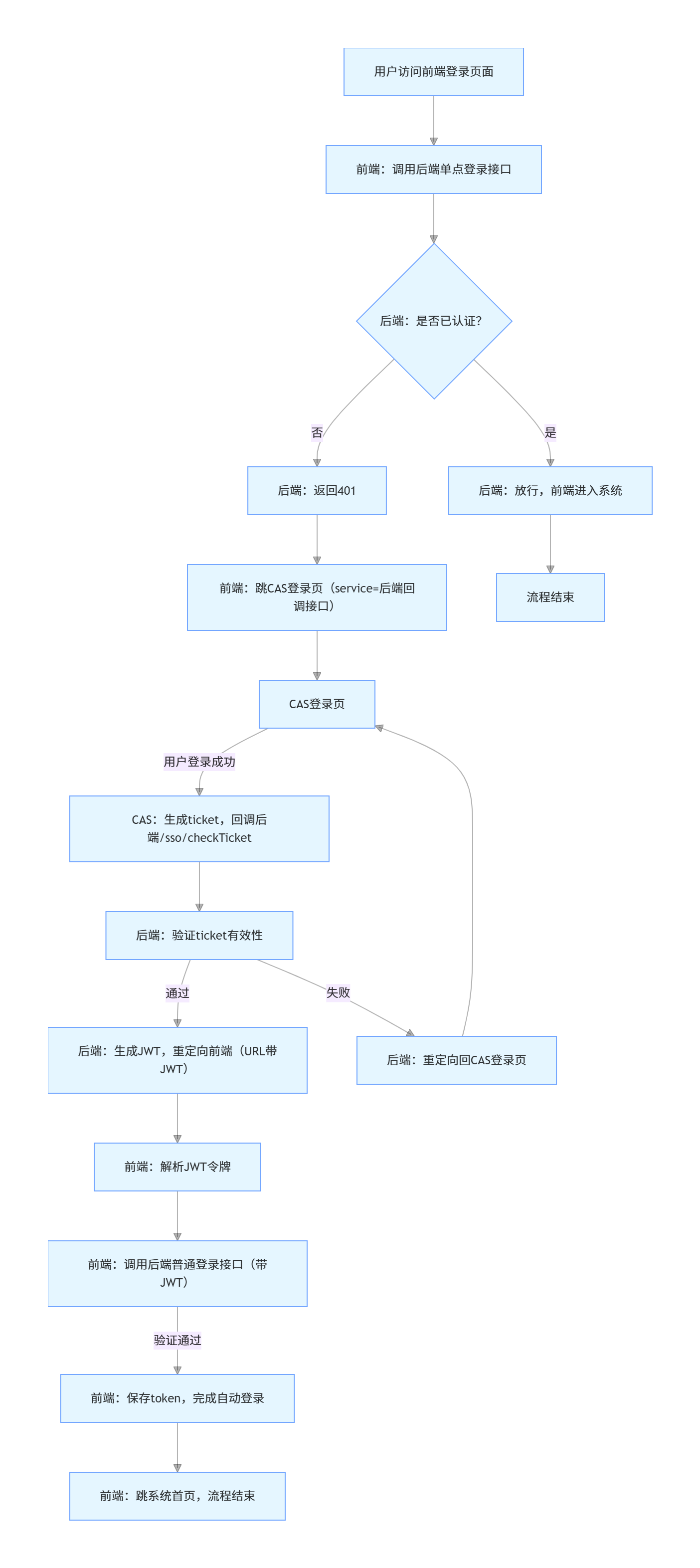 ③ 前端应用:仅负责页面展示、引导用户跳转CAS登录页、解析后端传递的最终凭证(如JWT),不参与CAS票据的直接验证流程。