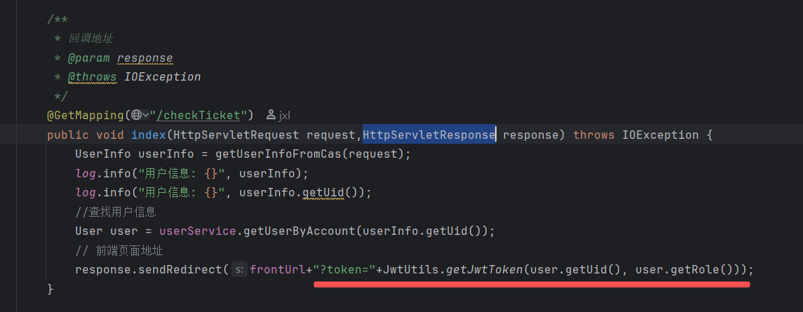 后端基于CAS返回的用户信息生成JWT令牌(最终登录凭证),通过response.sendRedirect()重定向到前端页面,并将JWT拼接在URL中: