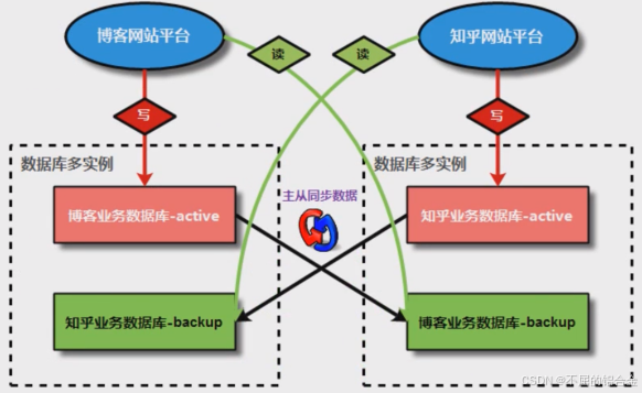 - 上层是"博客网站""知乎网站"两个独立业务;底层通过数据库多实例部署,给每个业务配了"主实例(处理写请求)+ 对方业务的从实例(备份+处理读请求)";核心逻辑是"主实例写数据,通过主从同步把数据备份到对方的从实例",同时读请求可以跨实例分散。