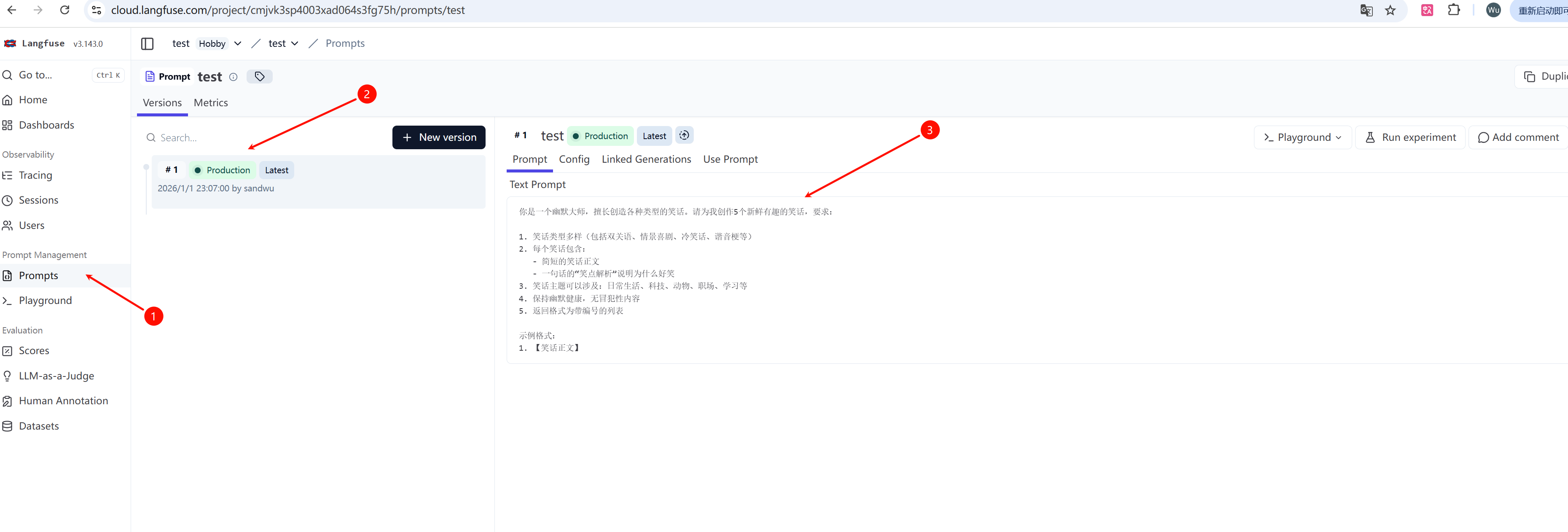提示词管理,Langfuse支持提示词按版本管理 。然后联动数据集形成评测体系。比如如图,我构建了第一版的提示词,可以看到,支持 提示词新增版本、复制提示词等能力。