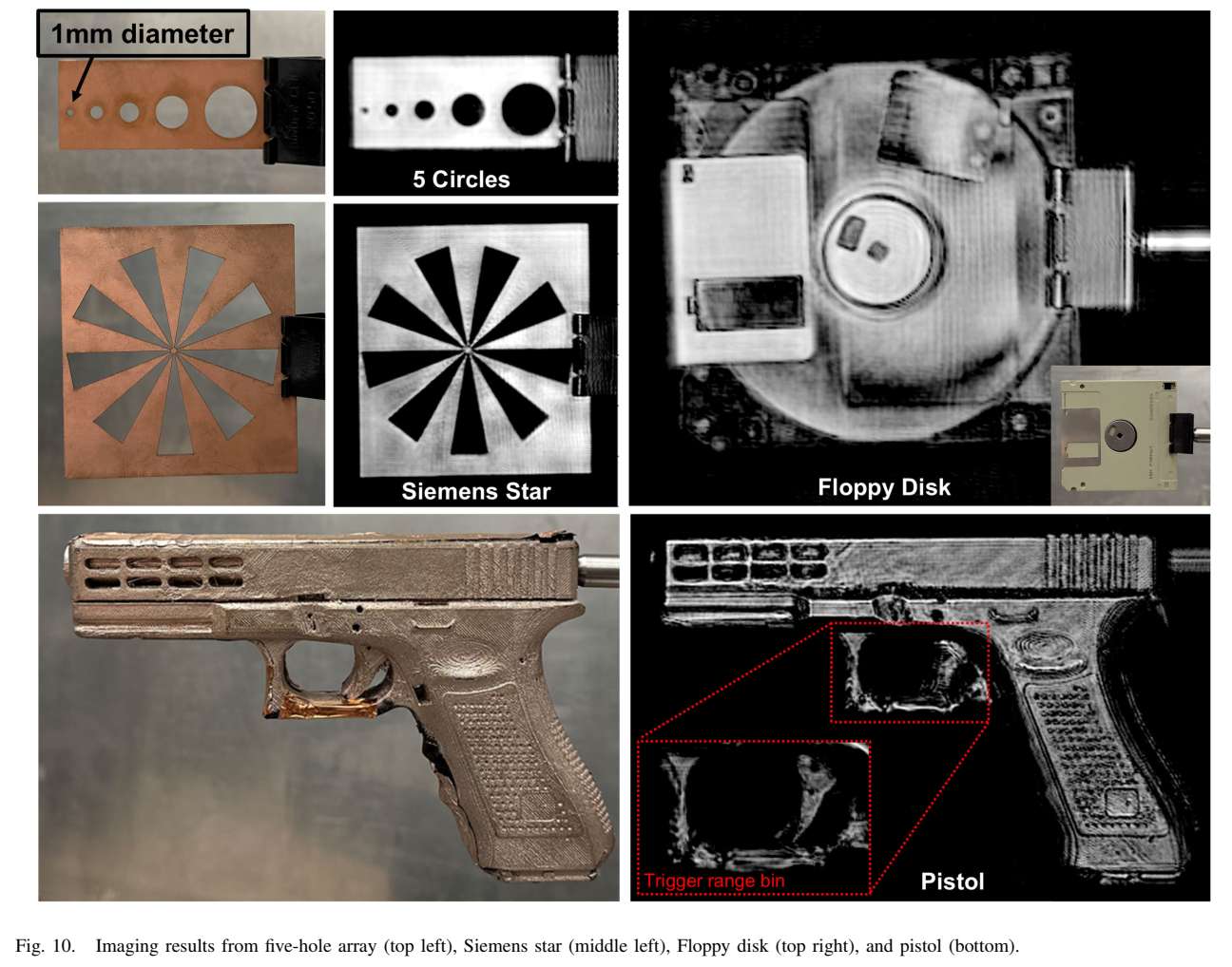 接下来使用两个真实目标:软盘和涂铜漆金属化的3D打印手枪。软盘图像揭示了内部磁盘和肉眼不可见的其他几个特征,从而演示了无损检测作为可行应用。手枪图像质量和分辨率也是前所未有的,显示了手柄和枪管上的多个精细特征。扳机处于略微不同的距离分格(trigger range bin),改变距离分格后可见其完全聚焦。