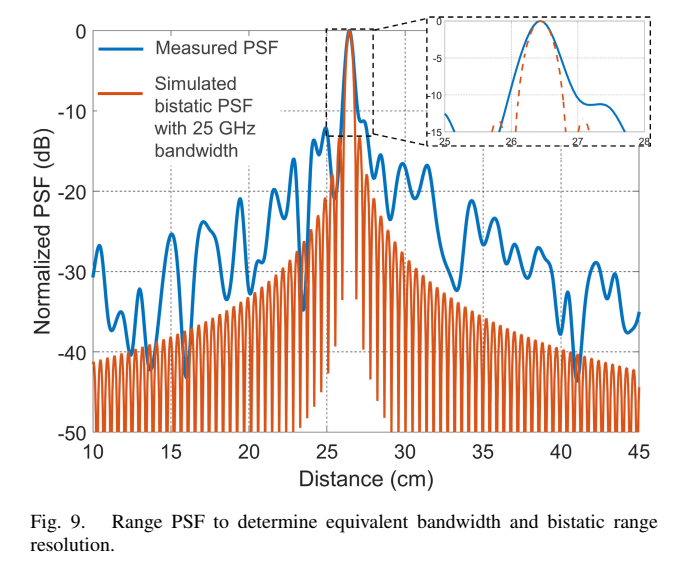 双基地系统的距离分辨率没有良好定义(即 ≠c/2BW\neq c/2BW=c/2BW),因为存在两个相位中心。例如,沿TX和RX连线的距离分辨率是无限的,因为该线上所有点具有相同的"距离"。注意双基地系统中等距离面是椭球而非球面。在双基地基线的远场,相位中心可近似为TX和RX的中点,距离分辨率可独立于距离定义。然而对于该系统,77 mm基线对应的远场距离约为10 m,使这种测量不切实际。因此,论文通过比较测量的点扩散函数(PSF)与仿真的PSF来演示距离性能,如Fig. 9所示。仿真PSF基于具有25 GHz 3 dB带宽的相同双基地系统。比较两个结果显示良好吻合,主瓣和旁瓣结构一致,表明雷达具有约25 GHz的3 dB带宽。