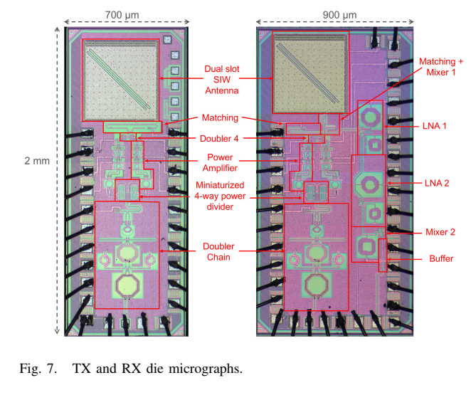 TX和RX在TSMC 65nm CMOS工艺中作为两个独立芯片制造。TX芯片包含TX信号的倍频器链和功率放大器(PA),RX芯片包含TX链的副本以及构成超外差架构的中频电路。设计目标是实现高带宽和高辐射功率,并向空气辐射(即正面辐射)而非向硅基底辐射------后者是常见做法。