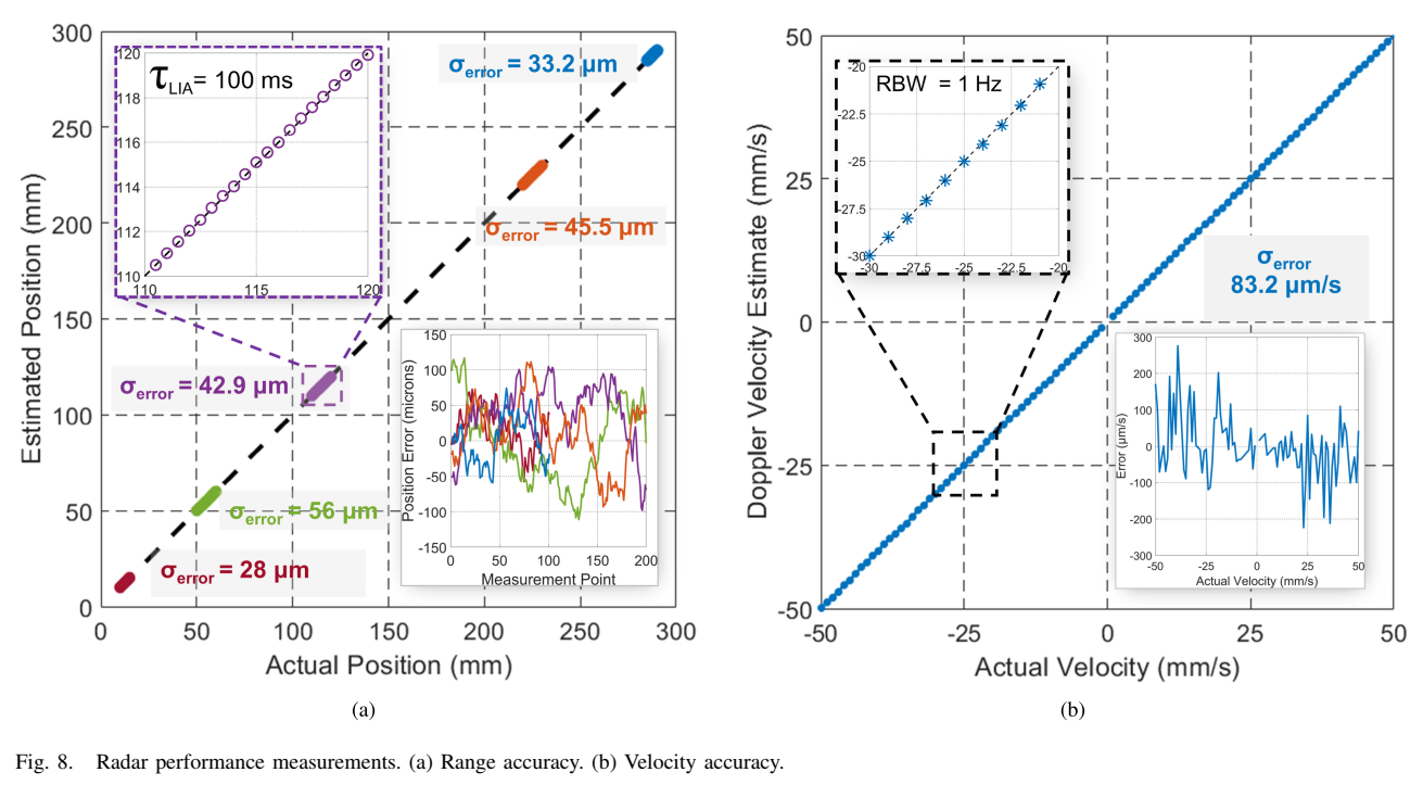 Fig. 8展示了雷达性能测量结果。距离精度和速度精度通过将4×4英寸的平面金属板(角反射器具有更高的RCS但不能用于双基地雷达,因为其双基地RCS方向图很窄)平行于TX-RX系统放置,并在精密线性平台上沿法向远离系统移动来测量。锁相信号的测量相位被解折叠并根据方程(5)映射到距离。
