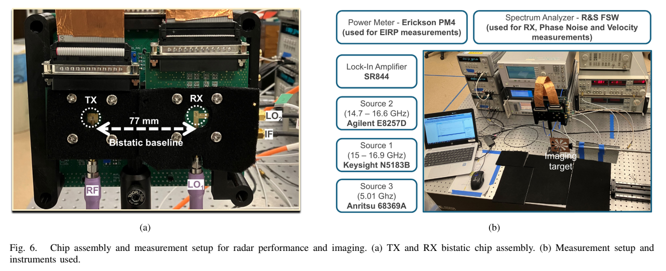 雷达系统按双基地配置组装用于雷达性能和成像实验,如Fig. 6所示。Fig. 6(a)展示了TX和RX双基地芯片组装,TX和RX芯片间距77 mm(即双基地基线)。Fig. 6(b)展示了测量设置和使用的仪器,包括:Erickson PM-4功率计(用于EIRP测量)、Rohde & Schwarz FSW频谱分析仪(用于RX、相位噪声和速度测量)、SR844锁相放大器、Keysight N5183B信号源1(15-16.9 GHz)、Agilent E8257D信号源2(14.7-16.6 GHz)和Anritsu 68369A信号源3(5.01 GHz)。成像目标放置在精密XY平台上。