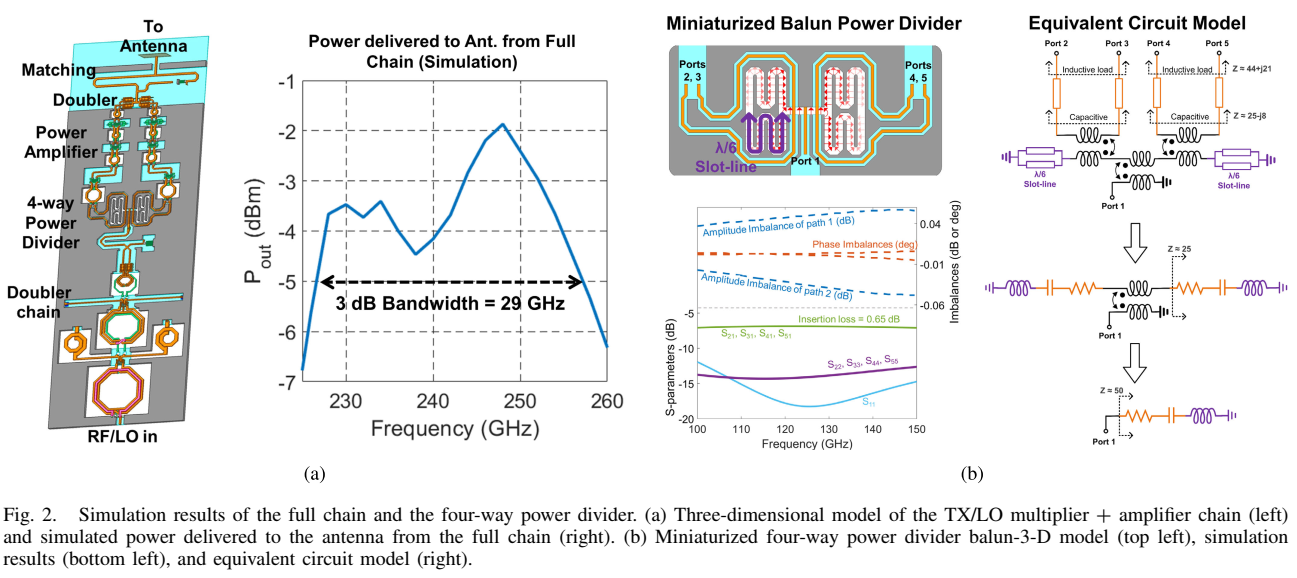 功分器后接三级PA进一步提升功率以驱动最后一级倍频器。PA每级采用中和差分共源放大器,偏置在0.3 mA/μm电流密度,实现9 dB增益,对于3 dBm输入功率实现6.8%的峰值功率附加效率(PAE)。交叉耦合中和与使用变压器的级间匹配网络相结合实现宽带响应。PA输出后接最后一级倍频器。为使布局紧凑,使用交叉结将PA连接到最后一级倍频器,这种结构在差分信号做直角转弯时保持每条路径长度相同非常有用。最后两级倍频器的输出合并并匹配到天线。最后一级倍频器和天线进行协同设计以最小化TX和RX芯片中匹配网络的复杂度。Fig. 2(a)展示了全链路的三维模型以及倍频器链和PA交付给天线的仿真功率,显示3 dB带宽为29 GHz。