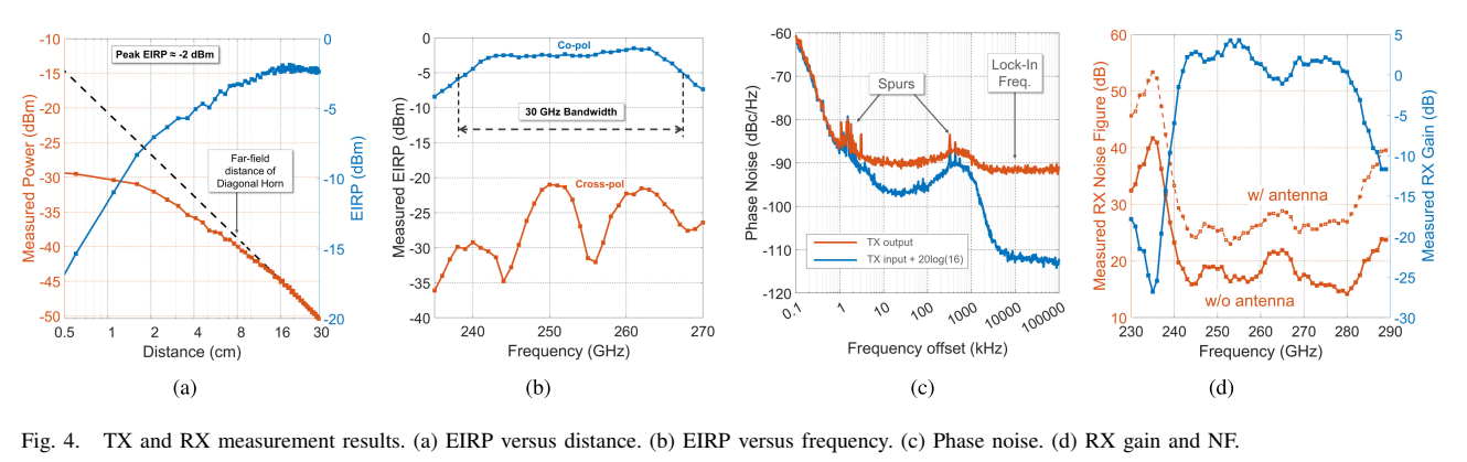 TX和RX的测量结果如Fig. 4所示。EIRP使用Erickson PM-4功率计测量,将其放在线性平台上并增加距离直到接收功率遵循Friis传输方程。如Fig. 4(a)所示,在距离约8 cm处进入远场区域,测量功率与对角喇叭天线的远场距离一致。实现的峰值EIRP为-2 dBm,略高于仿真,可能是由于天线金属损耗使用了过于保守的值以及PCB大型金属地平面增加了天线增益。如Fig. 4(b)所示,测量的同极化EIRP在30 GHz带宽内保持在-5 dBm以上,交叉极化EIRP显示了整个频带内的高极化纯度,低于同极化约20 dB。