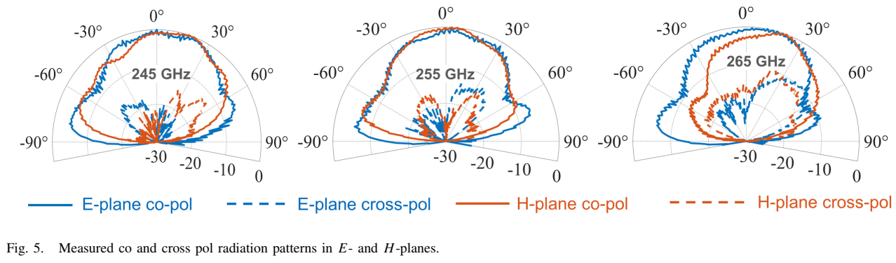 片上天线的归一化同极化和交叉极化辐射方向图在E面和H面测量,使用频谱分析仪、外部混频器、TX芯片和旋转平台。结果如Fig. 5所示,分别展示了245 GHz、255 GHz和265 GHz三个频点的方向图。半功率波束宽度在整个频带内约为60°,交叉极化功率在大部分频带内低于同极化20 dB以上。如此宽的波束宽度对于近场SAR成像是理想的,确保目标被合成阵列的每个元素照射。这也使双基地雷达更容易,因为TX和RX之间的波束重叠度很高。低天线增益由SAR的高处理增益补偿------直观理解是,更宽的天线波束意味着更多的合成元素照射给定目标,虽然每个天线接收的信号功率较低,但当来自更大合成阵列的信号相干相加时,噪底也降低相同的量------这就是SAR的动态范围和分辨率与天线增益无关的原因。