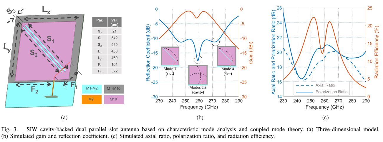 由于槽是平行的,在整个先进的30 GHz(12%)带宽内保持了高极化比和轴比。如Fig. 3©所示,轴比在整个频带内保持在14-26 dB之间,极化比超过18 dB,辐射效率约为5-20%。这种天线的主要优势是可以轻松缩放到不同频段和制造工艺。适当设计和放置模式可以提供宽带宽和/或尖锐的带外滚降。然而,SIW腔体顶层和底层金属之间的有限间距在向低频移动时限制了带宽。据作者所知,这种由带状线馈电的双平行槽SIW天线设计是新颖的,在现有天线文献中未见报道,包括片外PCB实现。