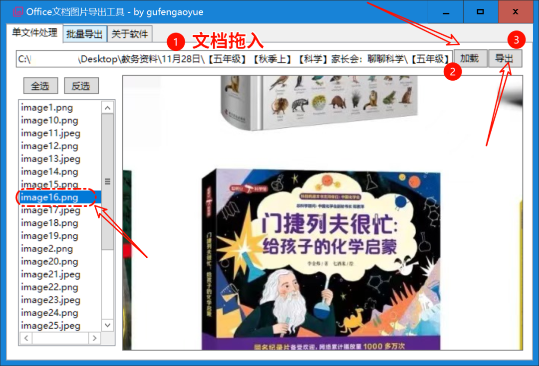 用户仅需将文档拖入软件界面,点击【加载】,系统便会自动提取并列出所有图片,支持即时预览。