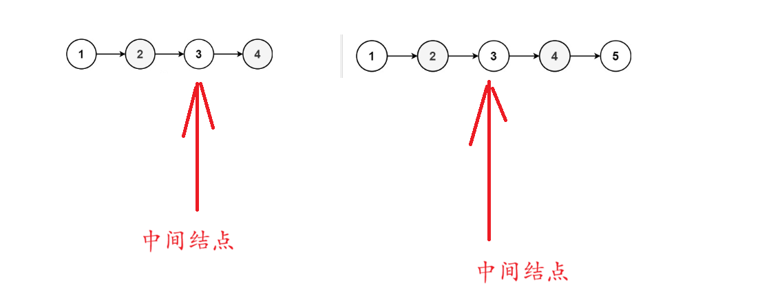 //此时 slow 就是中间结点,如果是偶数链表:1 2 3 4 此时 slow 指向的就是 3