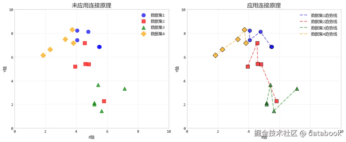 这就像在地图上连接各个城市来显示旅行路线一样,使相关的点之间建立了明确的视觉联系。