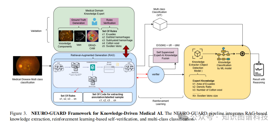 NEURO-GUARD是一个革命性的医学AI框架,将视觉Transformer与知识引导推理相结合,通过检索增强生成(RAG)机制和大语言模型自我验证,实现了高精度、可解释的跨域医学影像诊断。在糖尿病视网膜病变分类中准确率达84.69%,超越基准模型6.2%。