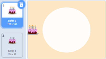 蛋糕有两个造型,初始位置在舞台最左边,scratch运行下列程序后,舞台上能看到?( )