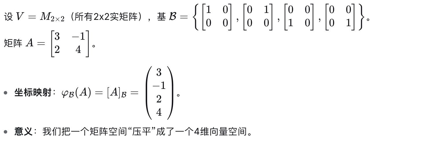 向量空间V中的所有线性关系, 都会原封不动地体现在它的坐标表示中; 在V中做运算, 等同于