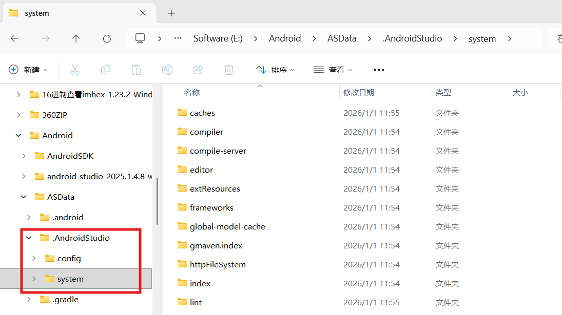 # idea.config.path=${user.home}/.AndroidStudio2025.1.4/config,这是定义AndroidStudio一些配置文件的地方。我们可以修改路径为自己的新路径,比如在下面加一行:idea.config.path=E:/Android/ASData/.AndroidStudio/config(具体路径你可以修改为你自己的) -