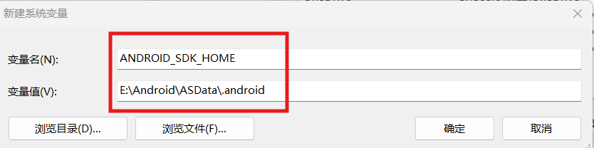 变量值:你自己定的其他盘的一个路径(路径里一定不要有中文! ),比如我的是在:E:\Android\ASData\.android