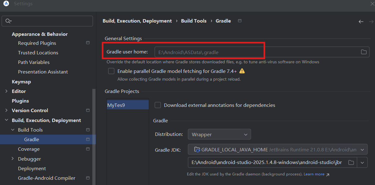 打开 settings 面板,确认 gradle 的 user home 为我们的新路径: