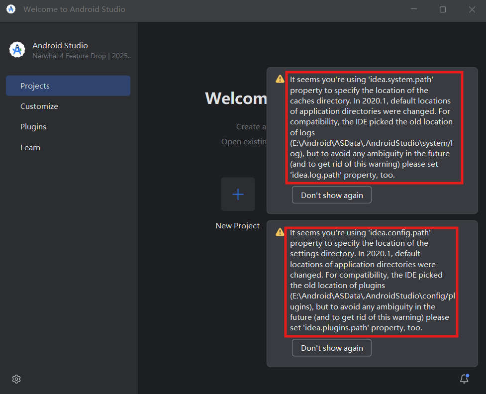 找到 AndroidStudio 安装位置下的idea.properties文件,比如我的位置是:E:\Android\android-studio-2025.1.4.8-windows\android-studio\bin\idea.properties。