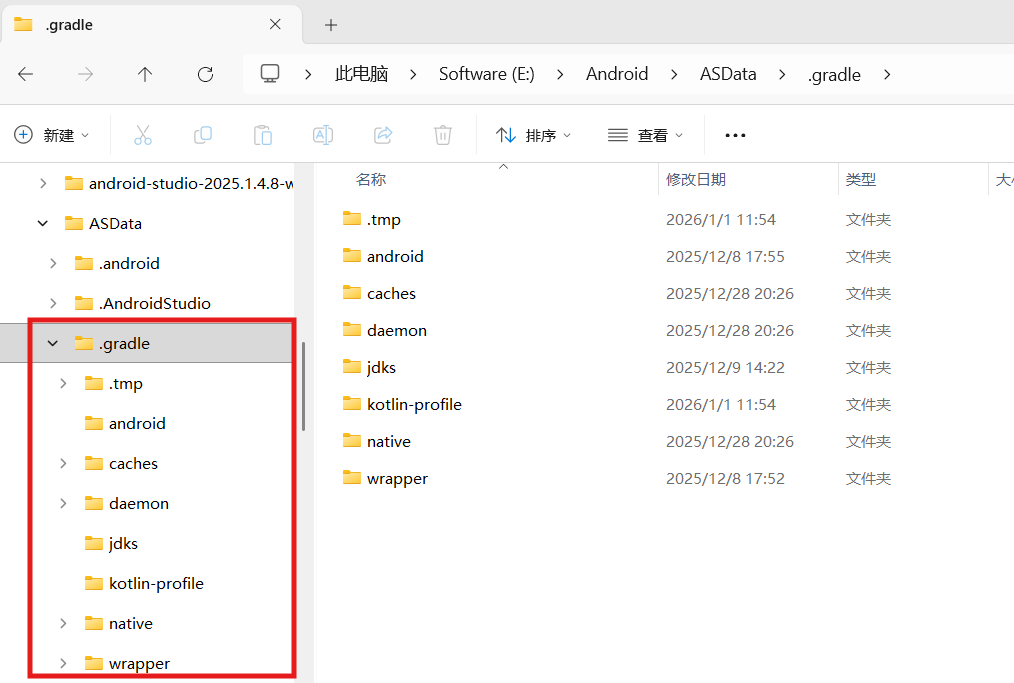 新的 gradle 路径下会出现下载的相关文件,比如我的:E:\Android\ASData\.gradle