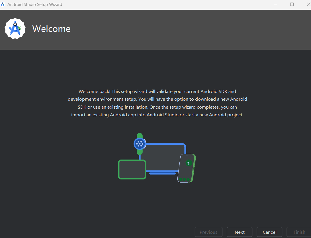 然后打开AndroidStudio,你会发现好像要重新安装了一样。不用担心,这是因为我们修改了配置文件,它需要重新读取和创建相关配置信息。像安装 AndroidStudio 时一样,按照引导,点下一步。
