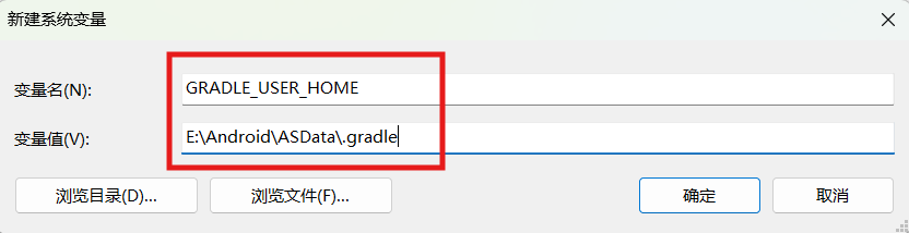 变量值:你自己定的其他盘的一个路径(路径里一定不要有中文! ),比如我的是在:E:\Android\ASData\.gradle