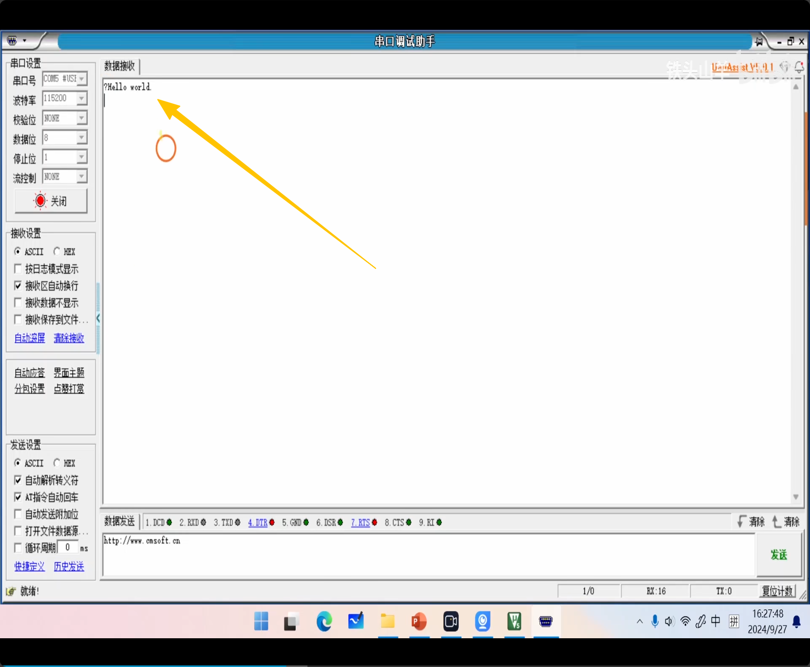 上图为串口测试正常示意图,串口调试助手正常接收发送来的字符串。