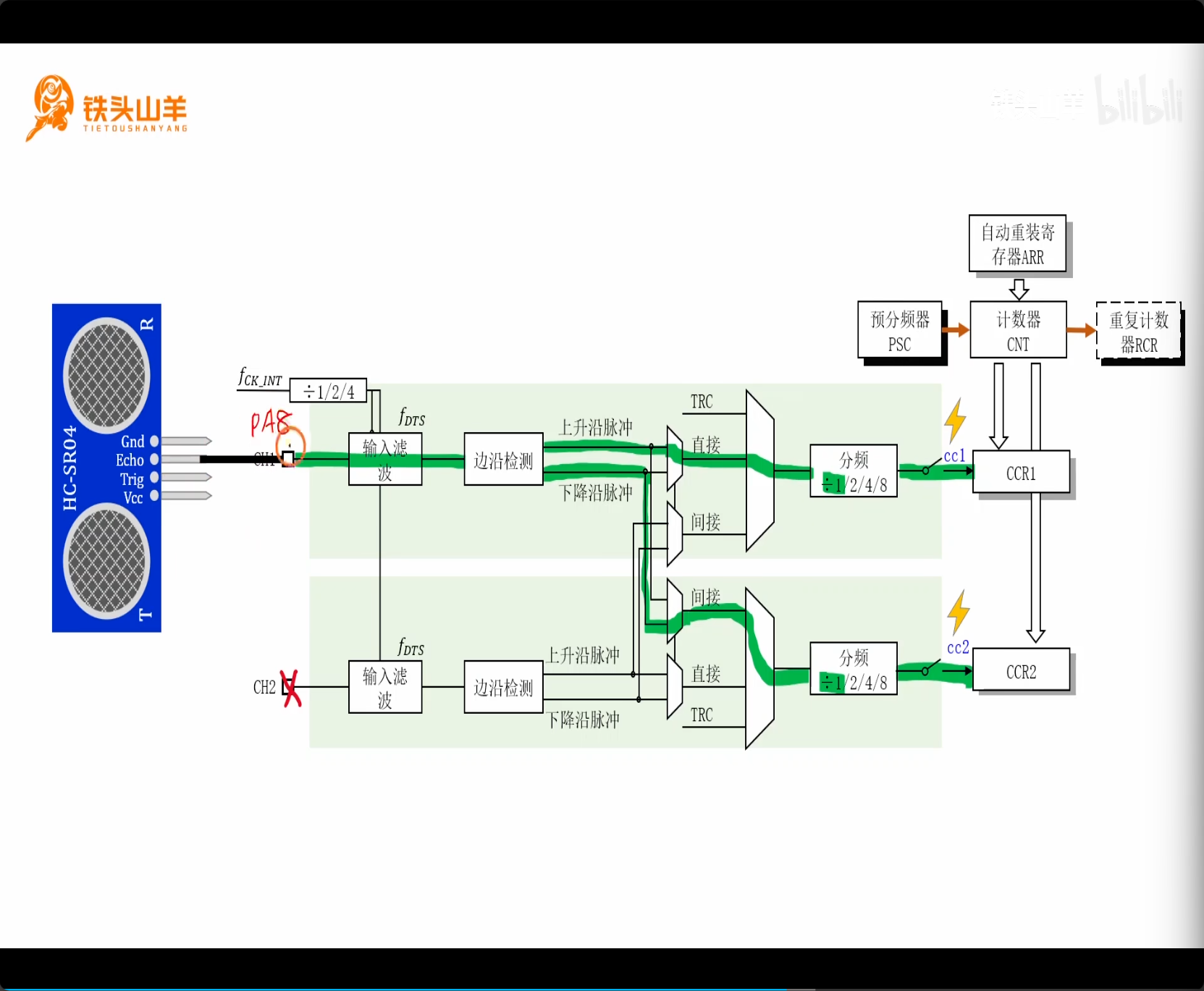 初始化输入捕获:初始化引脚(PA8),配置参数(输入滤波、边沿检测、信号选择、分频);