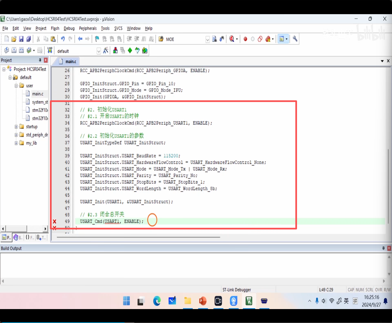 上图为串口测试代码。调用 usart.h,发送字符串测试。