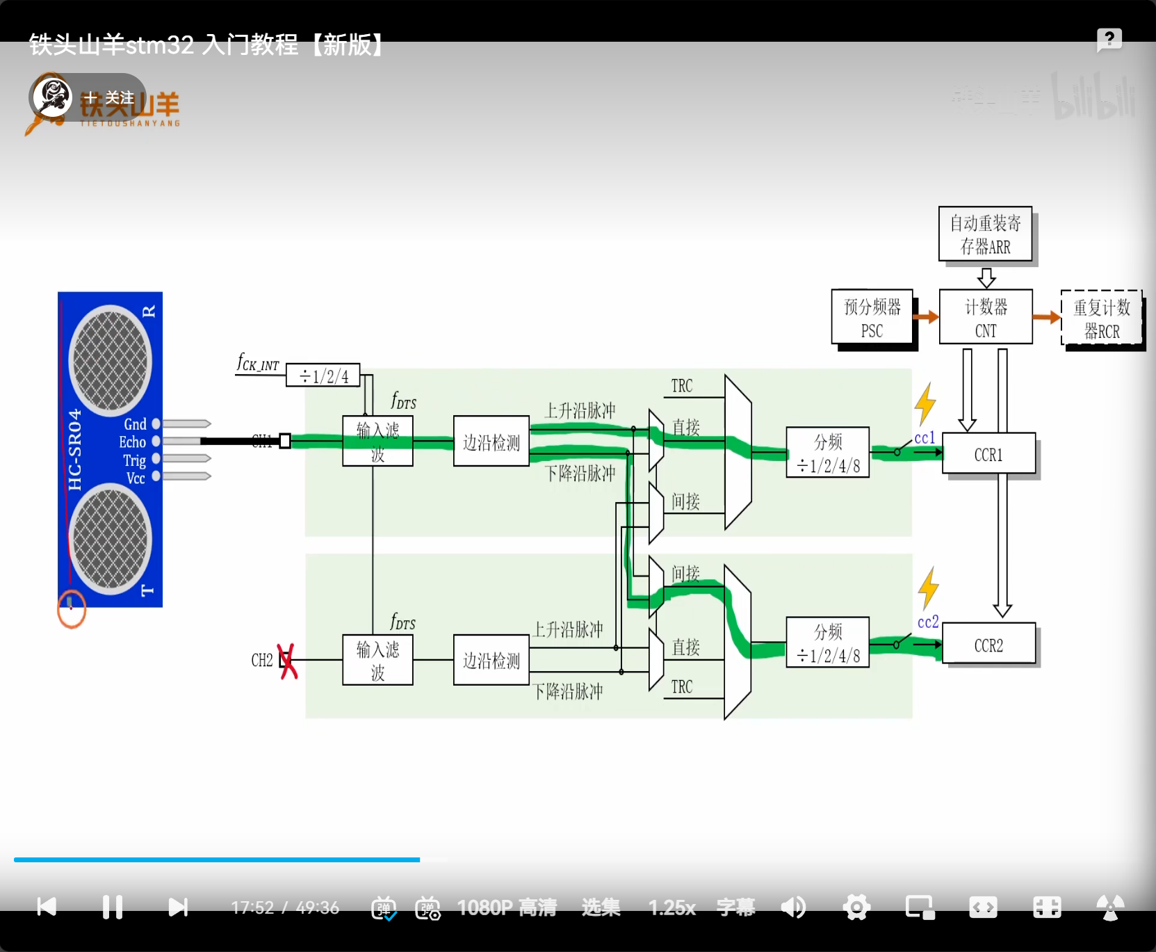 A:周期越长越好。如果短了,cc1 获取,溢出,到不了 cc2 的。因为 PSC、CNT、RCR、ARR 为 16 位寄存器,所以要周期最长,ARR 取 65535 即可。