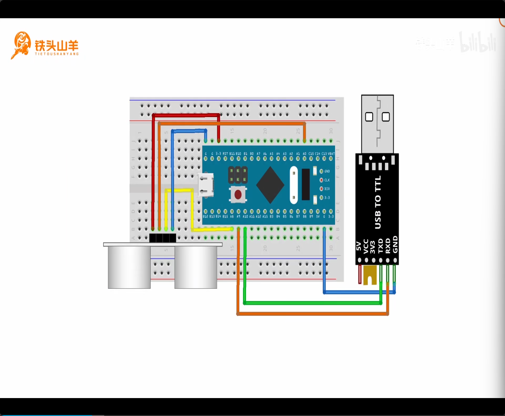 上图为超声波测距实验接线示意图。主要接传感器和串口引脚。