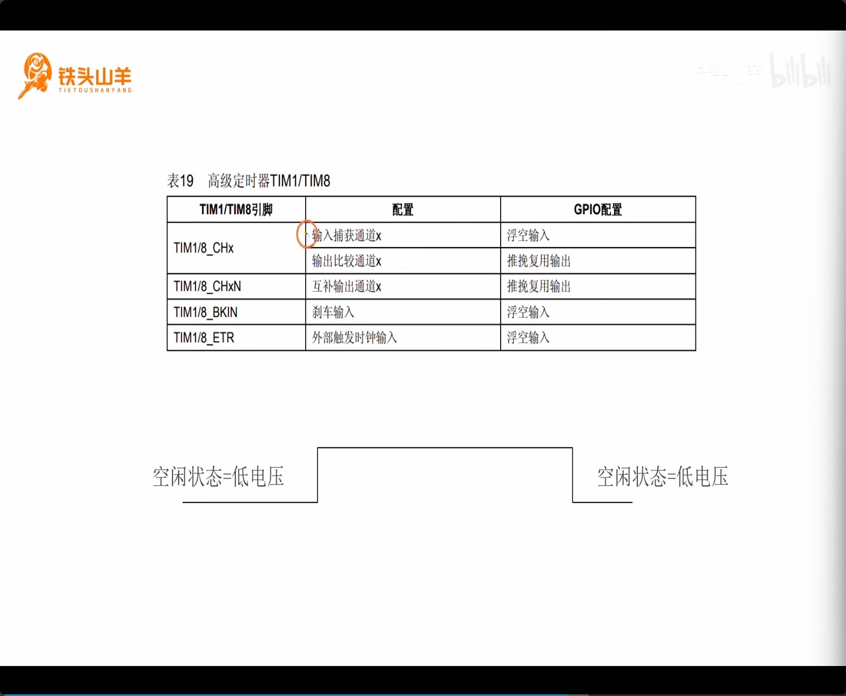 引脚配置:虽然表中建议 TIM1 的 CHx 引脚在输入捕获下配置成浮空输入,但是这个传感器的 Echo 引脚,在空闲状态为低电压,所以这里配置成**下拉输入(IPD)**更合理。