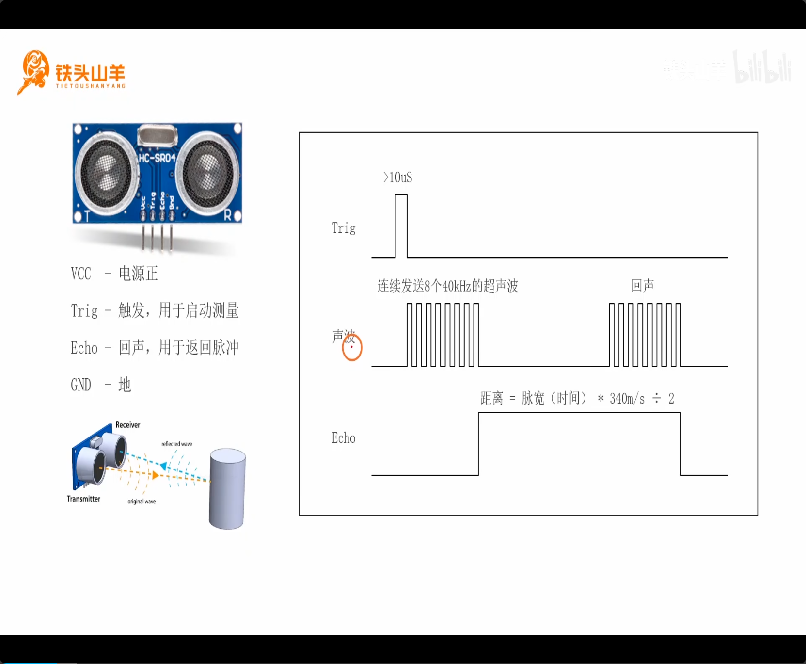 通过计算从声波发送结束 到回声传回结束这段时间,根据图上公式可以计算出实际的距离。