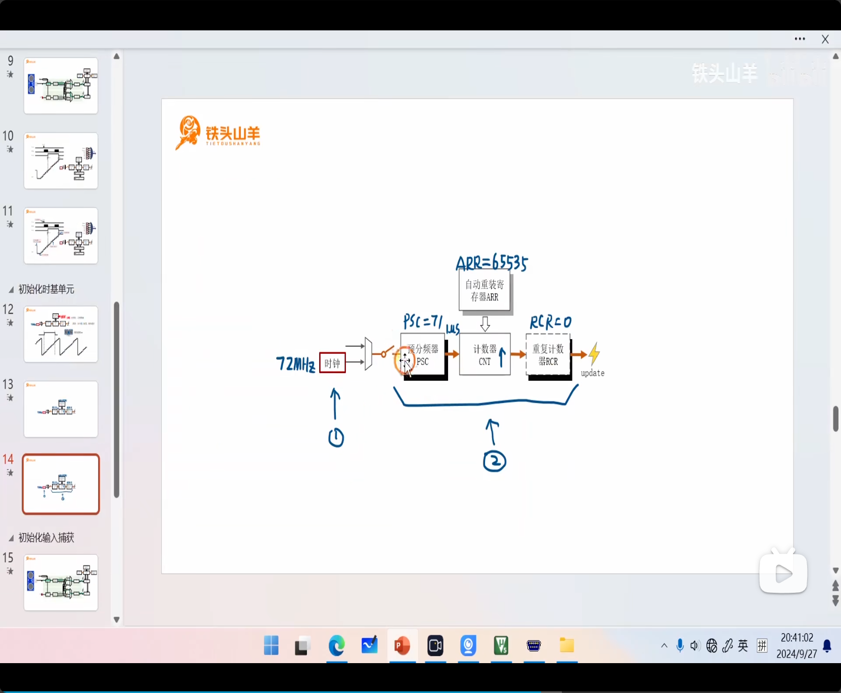 初始化时基单元:开启时钟,配置参数( PSC、ARR、RCR);