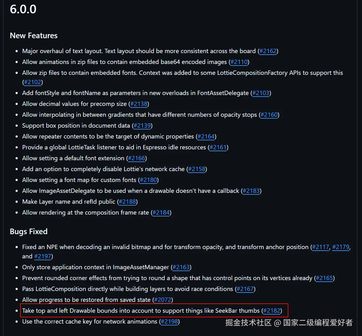 如果你的版本小于6.0.0,那么恭喜你,你可能在运行自己写的绘制代码后,lottie并未按照你设定的bounds显示,这是因为这前有bug导致left和top的设定是不生效的,在这个版本才被修复。所以最好用最新的版本,可以避免很多问题。