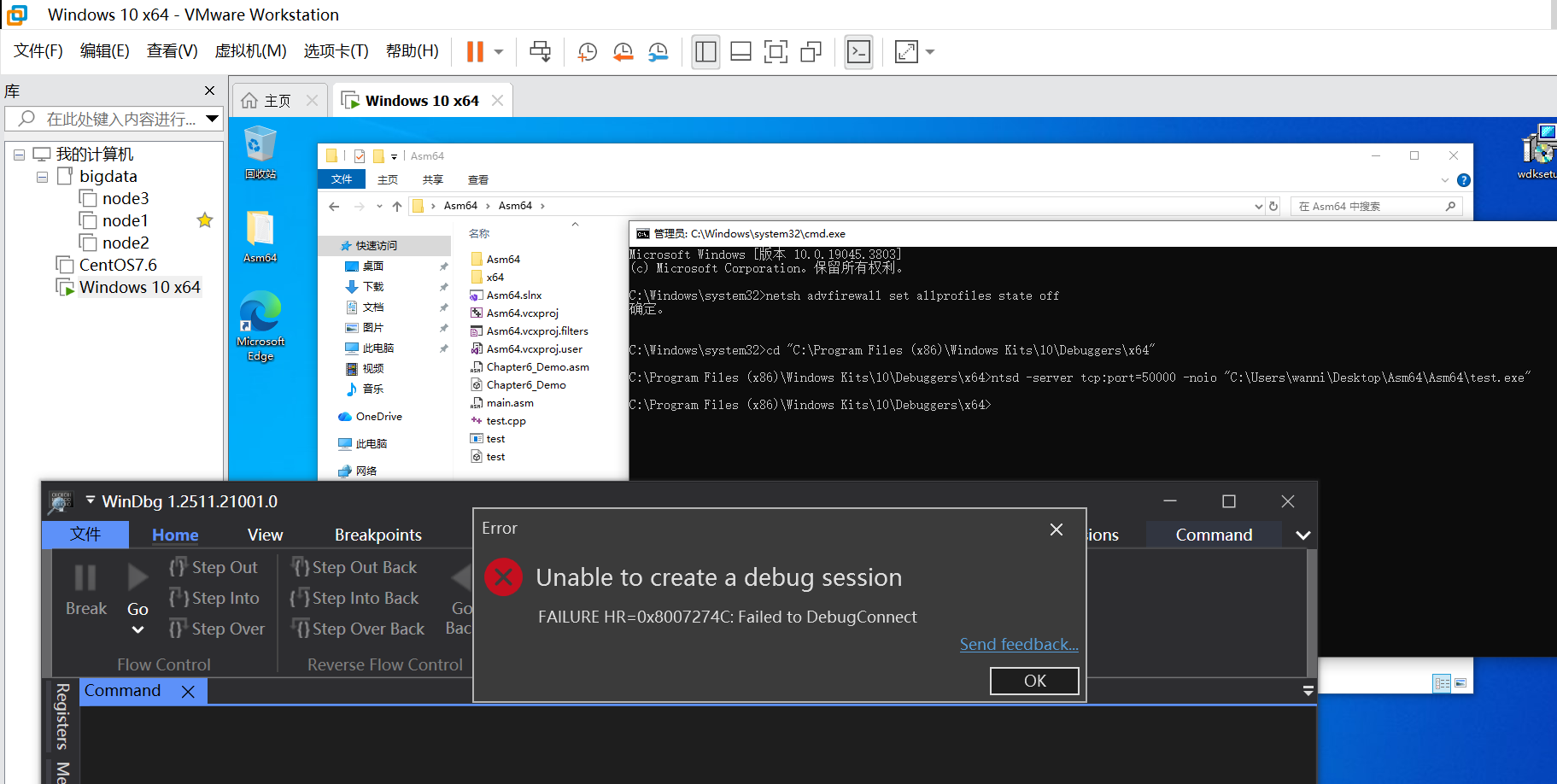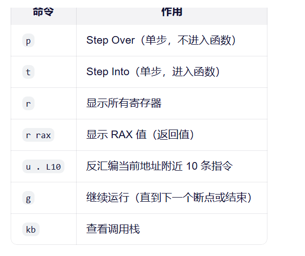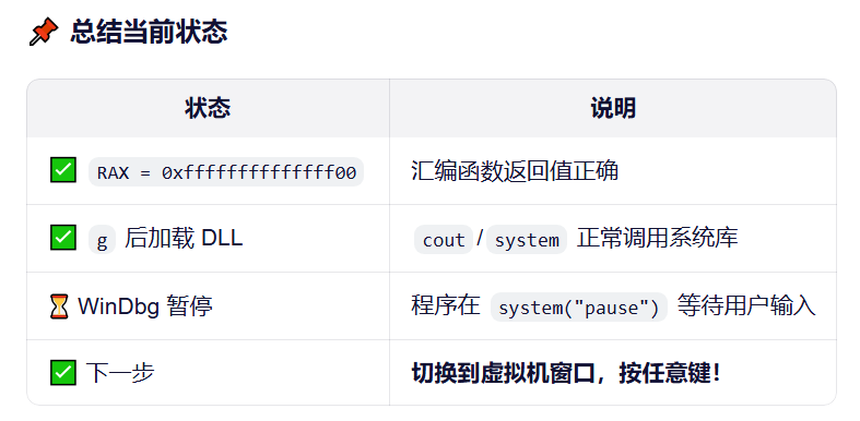 💡 如果程序停在 system("pause"),先切换到虚拟机窗口按任意键让程序继续,再在 WinDbg 中输入 q。