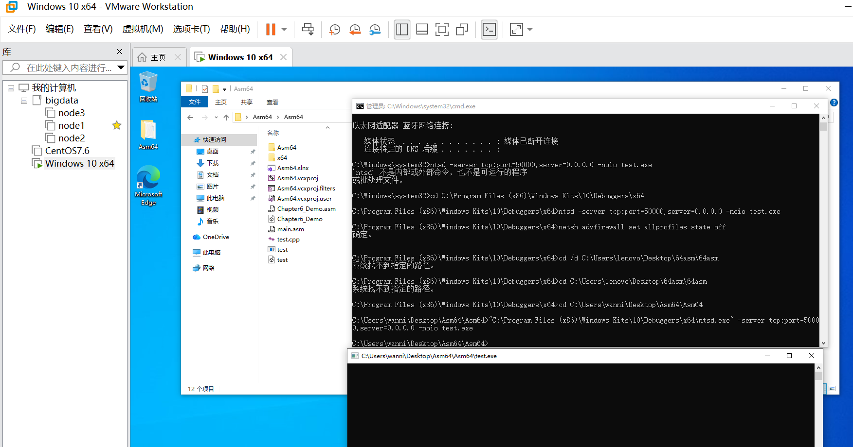 ⚠️ 关键:只要 ntsd.exe 或 test.exe 还在运行,test.exe 文件就会被锁定,导致下次编译失败(LNK1104)。