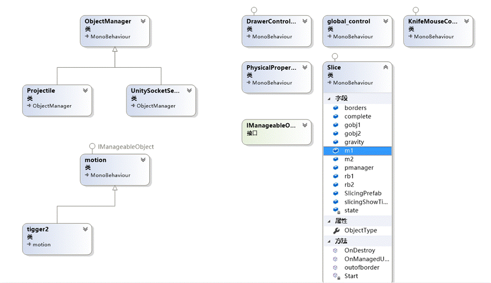 为6种水果分别构建 "slicing 层 <--- complete 层(挂载预制体) + slice 层(挂载预制体)<----motion.cs(继承类的父类)" 三级独立预制体,为炸弹构建"tigger(1).cs"单层脚本(继承自motion.cs),挂载粒子系统组件。