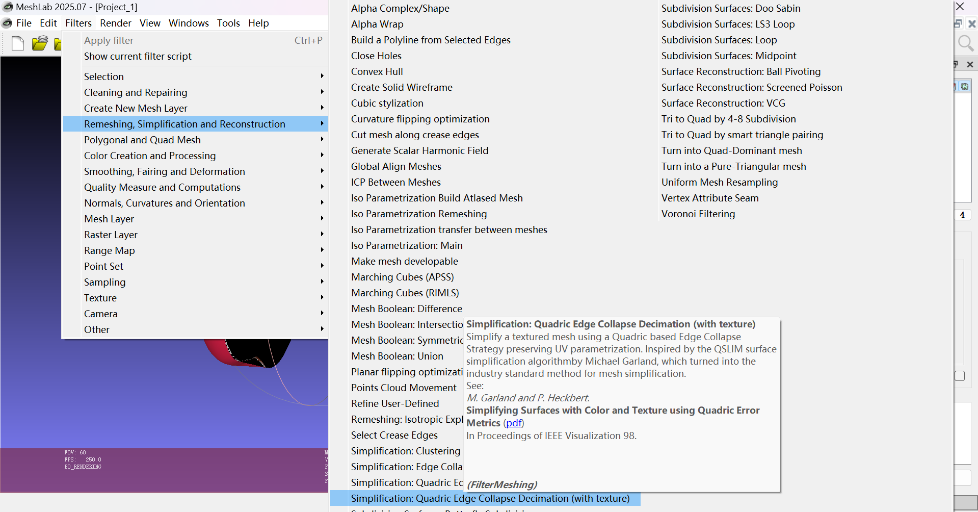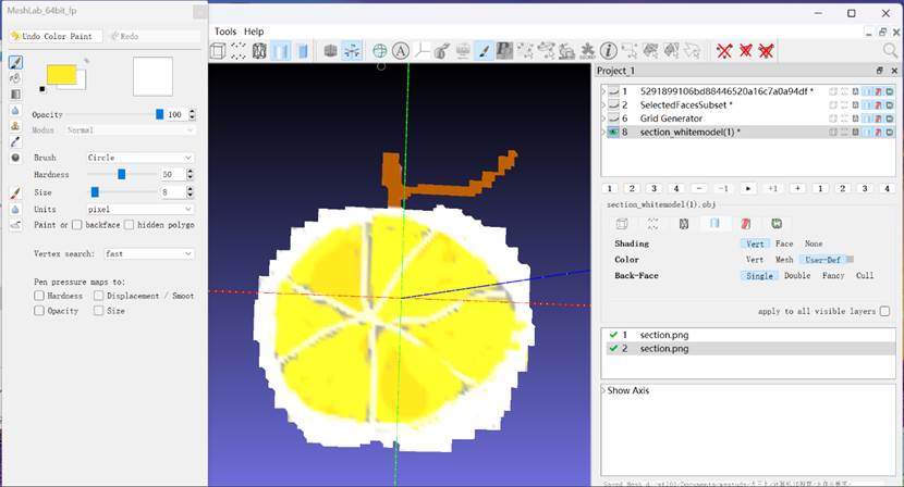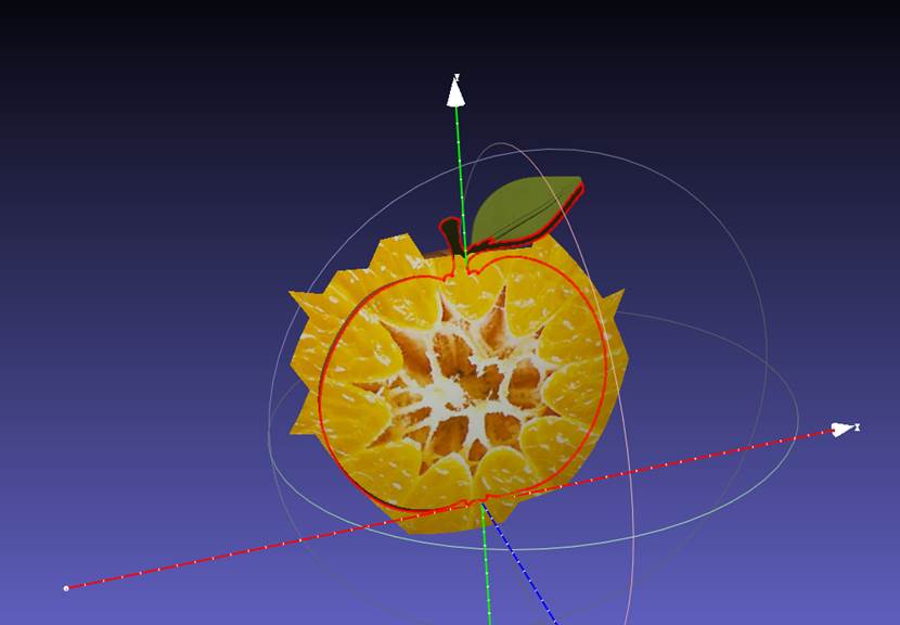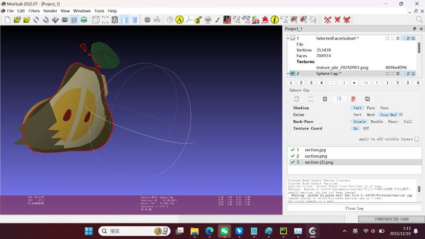 (1)使用自编写脚本SFM算法+深度相机360°扫描构建水果点云模型,通过MeshLab处理导出为.obj模型;使用腾讯混元3D模型生成.obj水果完整体模型;使用MeshLab处理并二次型边缘下采样算法压缩获得.obj水果碎块体模型。