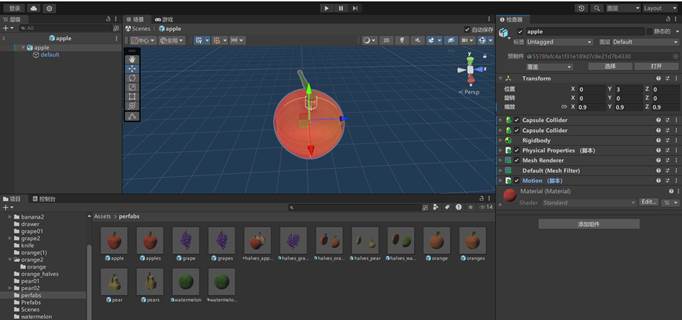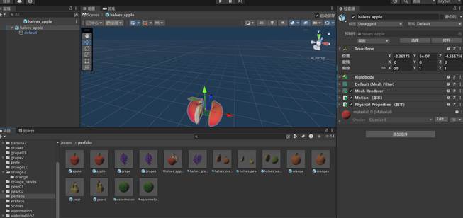挂载motion.cs和PhysicalProperties.cs脚本,在 Hierarchy 面板选中水果切片模型,移除多余组件,仅保留Rigidbody、Mesh Filter、Mesh Renderer、Motion脚本和Physical Properties,为水果切片添加合适的物理性能,确保水果切片不再和其他物体发生碰撞,生成基础切片组件预制体。以苹果为例。